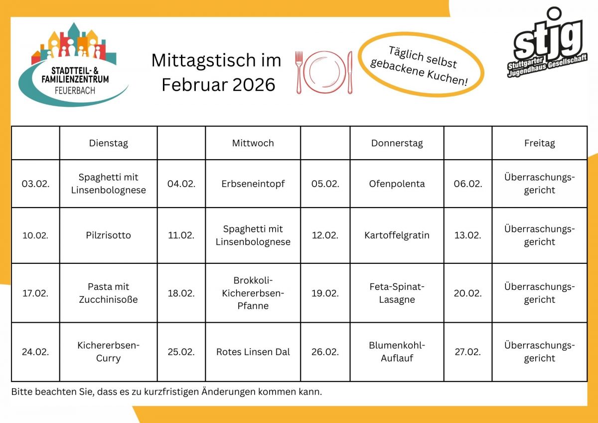 Von Dienstag bis Freitag bieten wir ab 12 Uhr ein frisch zubereitetes Mittagessen an.