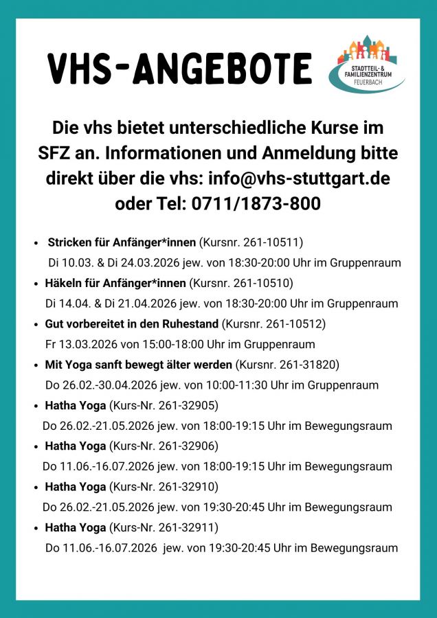 Haben Sie Fragen, Anregungen oder Lust sich ehrenamtlich im SFZ Feuerbach einzubringen? Dann rufen Sie an, schicken eine E-Mail, schreiben über das Kontaktformular oder kommen Sie einfach vorbei!